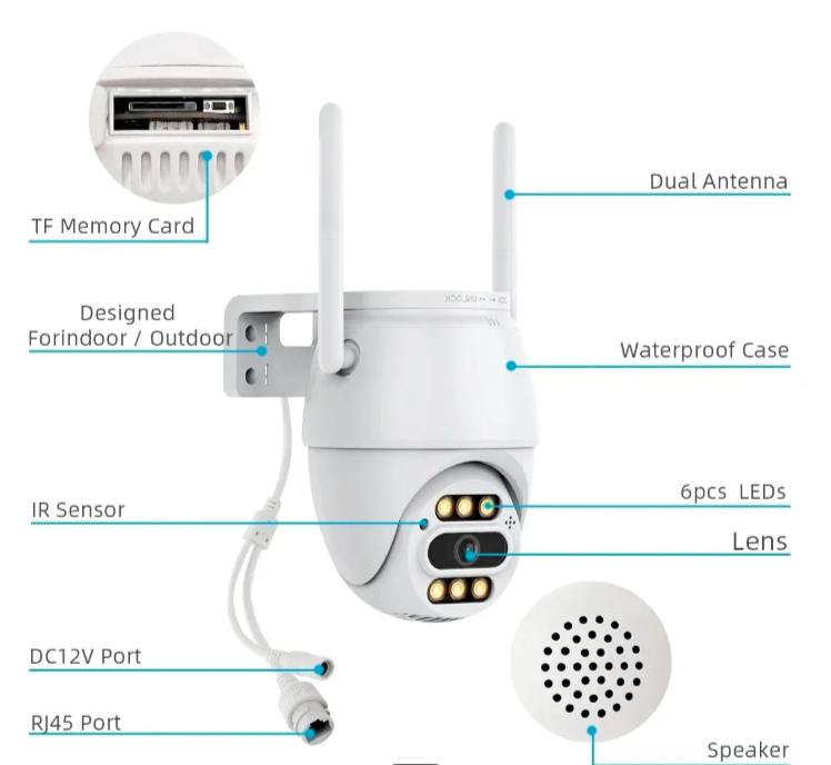 Opremljena visokom 10MP rezolucijom, ova rotirajuća PTZ kamera omogućava detaljan prikaz u realnom vremenu. Zahvaljujući 5x digitalnom zumu, lako se uočavaju detalji, dok autotracking funkcija automatski prati kretanje ljudi.