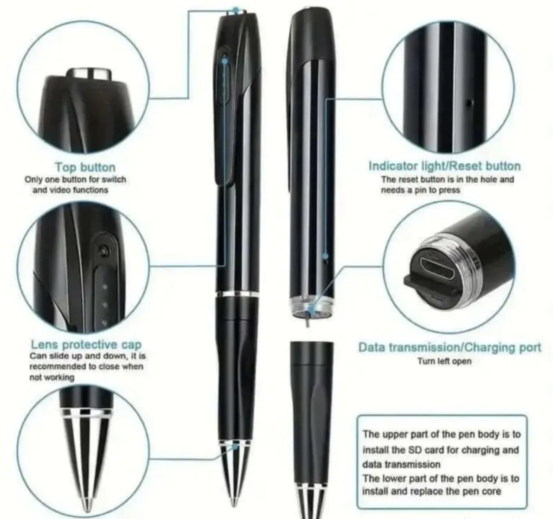 Ova kamera olovka izgleda i funkcioniše kao obična hemijska olovka, a ujedno omogućava snimanje video zapisa sa zvukom. Zahvaljujući modernom dizajnu i tihom radu, uređaj je jednostavan za korišćenje i lako se uklapa u svakodnevno okruženje.